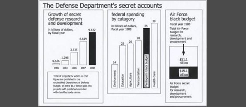 ANALYZOVÁNÍ ČERNÉHO ROZPOČTU USA „Ve vládních výborech se musíme mít na pozoru před získáním neoprávněného vlivu, ať již požadovaného či nepožadovaného vojensko-průmyslovým komplexem. Potenciál pro katastrofický vzrůst nemístné moci existuje a bude přetrvávat“. Citace rozlučky Dwighta Eisenhowera, určené pro národní vysílání 17.1. 1961. Těmito historickými slovy upozorňoval prezident Eisenhower národ na nebezpečí spojená s nekontrolovatelnými programy uvnitř vojensko-průmyslového komplexu. V tomto světě špionážních aktivit za scénou „černý rozpočet“ exponenciálně vzrostl. Pouze při malém kongresním dohledu a prakticky žádném veřejném zkoumání byly uvnitř tohoto černého světa vyvinuty programy, které užívají téměř neomezeného přístupu k finanční podpoře. Avšak jaké specifické podrobnosti o černém rozpočtu mohou