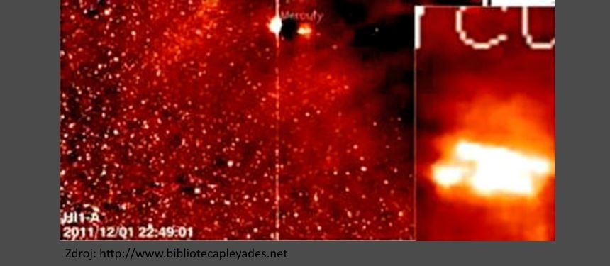 Byla odhalena poblíž Merkuru ukrytá mateřská loď UFO? Jeden ze dvou satelitů NASA Stereo monitorující sluneční aktivitu zachytil na film záběry toho, co se zdá být obrovskou válcovitou mateřskou lodí UFO blízko planety Merkur – 1. prosince 2011. Tato vesmírná loď se objevila zhruba poté, co byl Merkur zasažen koronárním výronem (CME) ze Slunce. Snímky tohoto objektu odhalují, že je válcovitého tvaru. Ve srovnání s blízkým Merkurem to naznačuje, že je obrovské velikosti, stovky mil a pravděpodobně je to nějaký druh mateřské lodi UFO. Je-li to skutečné a není-li to fotografický efekt, jak tvrdí někteří vědci, nebylo by to poprvé,