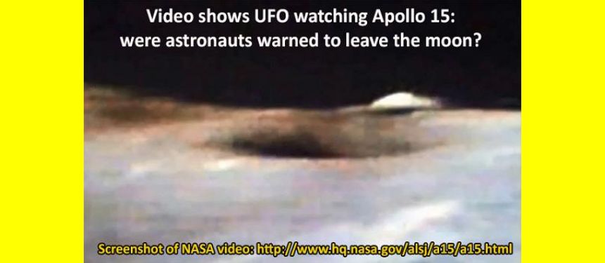 Video zobrazuje UFO, jak pozoruje Apollo 15 Astronauté varováni, aby opustili Měsíc Historický videozáběr Apolla 15 ukazuje UFO ve tvaru talíře, visící nad kráterem, očividně sledující 2 astronauty, jak chodí po Měsíci. Video Apolla 15 bylo nahráno na YouTube 5. března 2015 a zvýšila se možnost, že se jedná o vyspělou vesmírnou loď monitorující misi Apolla. Výpovědi astronautů a informátorů odhalily, že např. mise Apolla 11 byla monitorována dvěma vesmírnými loděmi, které visely nad kráterem – údajně poskytujíce varování NASA. Vesmírná loď by mohla být mimozemského původu. Další zajímavou možností je, že Apollo 15 nafilmovalo UFO, jež patří k vysoce